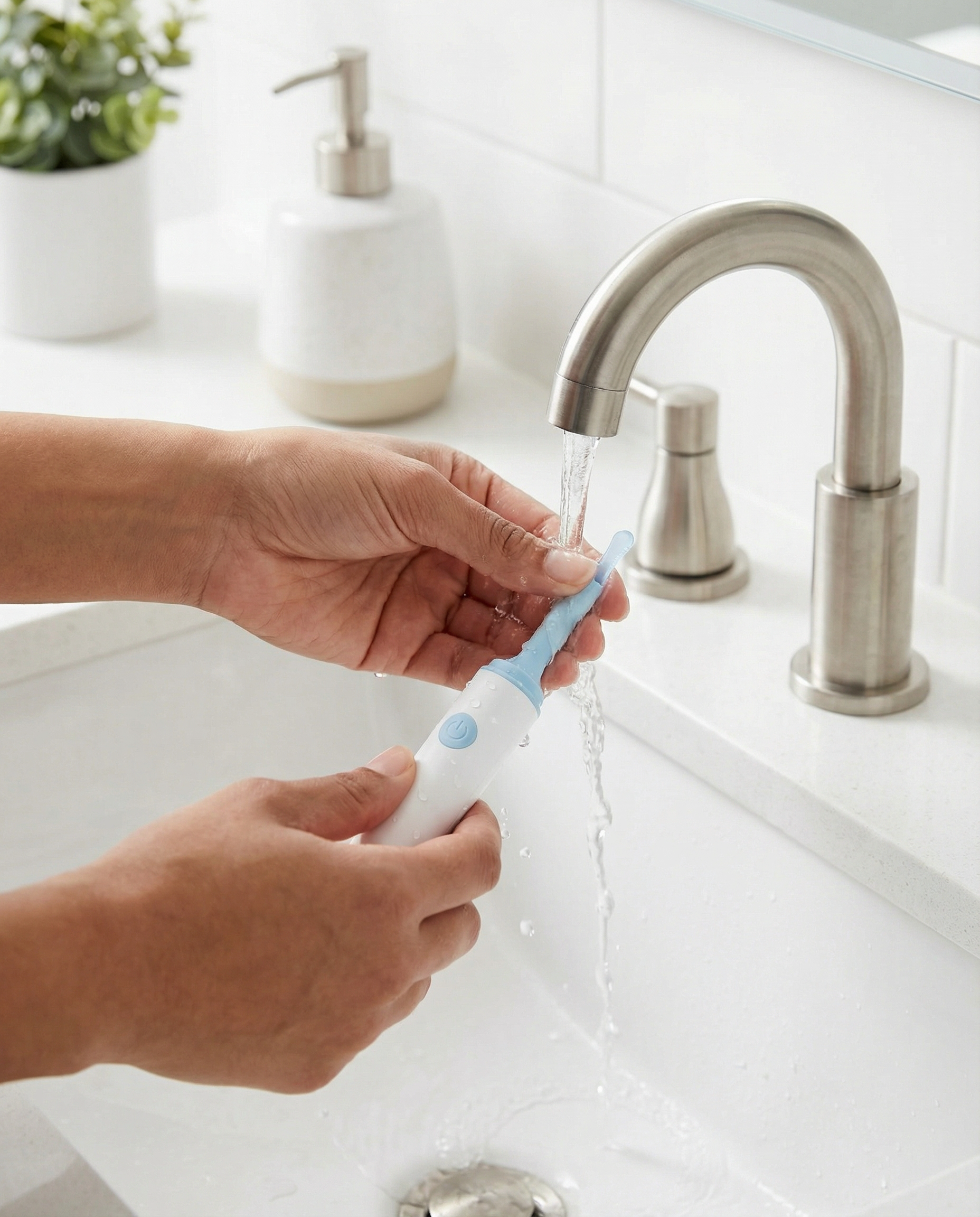 After use, remove the tip and clean it as directed in the product instructions. Keep the device clean and dry before storing it.
